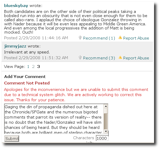 And what I found when I tried to post a comment to the article, "Matt Gonzalez joins Ralph Nader's ticket" by Zachary Coile and Cecilia M. Vega, has this new twist: