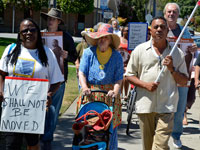 Community members marched through downtown Santa Cruz singing classic civil rights era hymns. When gathering at the town clock, one individual was applauded when it was announced that he had been present at the 1963 March on Washington, and several in the crowd raised their hands when asked who had been fighting for civil rights causes for 50 years or more.