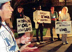 As part of a speaking tour across the United States, two representatives of the U'wa people visited the Bay Area October 10-16 to speak out against renewed oil drilling attempts in their territory. U'wa international representative and community organizer Daris Cristancho expressed her communities defiance against government threats to cut off social spending if the U'was do not permit drilling: "The laws of the U'wa do not change as the laws of the government do... We would rather live dignified lives deep in the mountains than be bribed [in exchange for drilling]."