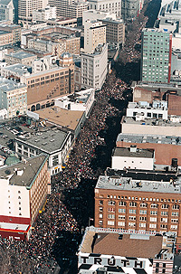 1/18: A massive anti-war protest happened today in downtown SF calling for no war on Iraq. The crowd stretched continuously from the foot of Market St. and filled the Civic Center to capacity.