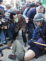 Early 10/11, hundreds of demonstrators blockaded and shut down the federal building in San Francisco as anger, frustration, and dissent against the impending war on Iraq and the world grows. Forty-six were arrested as the protesters' nonviolent civil disobedience was met with attacks from militarized riot police, federal employees, and even a Channel 2 cameraman.