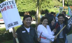 12/18/2004: The first shift of the 12 hour siege at the Claremont started off on December 18th. This is the 3rd holiday season the Hotel Workers at the Claremont have been denied a new contract, while the Right to organize by the Spa Workers remains under attack. Approximately 300 workers and their families have been spending every holiday for 3 years fighting with the Claremont. Picket lines and other job actions occur often and more are scheduled. 250 Food and Beverage workers are fighting for a fair contract, including affordable health care, fair wages and a voice on the job. 100 spa workers are fighting to be represented by their union free of coercion from the company.