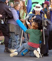 6/8/04: In a massive display of multi-agency overtime, city, state and federal police forces effectively shutdown the West Coast anti-G8 message and reasserted their hold on SF's main thoroughfares, at least for today. SF Reclaim the Streets had called for a mutant-themed anti-G8 Reclaim the Streets action in San Francisco today at 5 p.m. The sound system and costumed mutants gathered at UN Plaza, threw a stationary street party and then took to Market Street. Within a few blocks, however, a sizeable portion of the mass was encircled by SFPD, California Highway Patrol and Federal Protective Services. Officers reportedly offered the corralled demonstrators a chance to be either "cited and released" or arrested -- although when Freak Radio Santa Cruz correspondent Bradley attempted to leave the encirclement, he was beaten by police. Police ended up making around 150 arrests at 5th and Market Streets. Meanwhile, police attacked and beat with sticks a number of protesters, bystanders and a homeless man outside the encirclement. Several protesters were grabbed off the sidewalk and arrested for no reason at all, including several who had been photographing police violence. Police paddywagons blocked buses and trollies for over 4 hours. Photos: 1 | 2