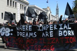 Several hundred protesters marched up Embarcadero starting at Justin Herman Plaza a little after 2PM. After five or six blocks the police forced everyone onto the sidewalk and arrested a few people after they stepped into the street. The protest went all the way up to Pier 39, but the police blocked the entrances and told protesters they would be arrested if they entered. The tourists at Pier 39 were not allowed to leave by the police until the protest had left the area. The march then looped on back streets to the Embarcadero and went up the sidewalk to Justin Herman Plaza. After the protesters rejoined the larger anti-war protest the police rushed in and tried to arrest someone. Protesters yelled at the police and the police line formed near the ANSWER stage. After perhaps ten minutes the police charged the crowd throwing three young men on the ground (the police stomped on one young man's head leaving a bloody mark above his right eye) After that the crowd slowly dispersed.
