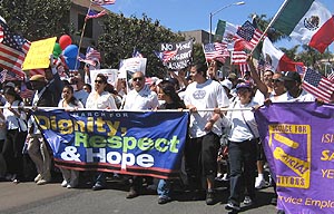 Protesters carried hand-lettered signs saying "No Human Being is Illegal", "We are America," "My Mexican immigrant son died in Iraq," "Don't deport my parents,""I'm a dishwasher - not a criminal," and "Si, se puede!" - "Yes We Can!" The crowd stretched two and half miles, from Union Park on the West Side to their rally destination in Federal Plaza.