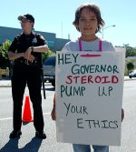 A “Dog Arnold” protest was held outside the KMJ studios in Fresno on June 24, 2005. The governator was talking on the Ray Appleton show.
