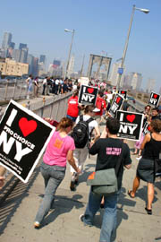 New York City 8/27:The multitude of banner drops, events and protests surrounding the Republican National Convention in NYC has begun. A Critical Mass bike ride is underway in Manhattan right now! Listen to the A-Noise broadcast from NYC for live updates throughout the week. The 4pm (PST) broadcast will be part of the launch of the Critical Mass Radio Network. The DNC2RNC march arrived yesterday (see photos here). They had been marching for 258 miles calling attention to the overwhelming similarities between the Democrats and the Republicans. Tomorrow, the March for Women's Lives begins at 11am (EST) (full schedule of events here), and the big UFPJ march will occur on Sunday. Check back here for photos and reports from the events.