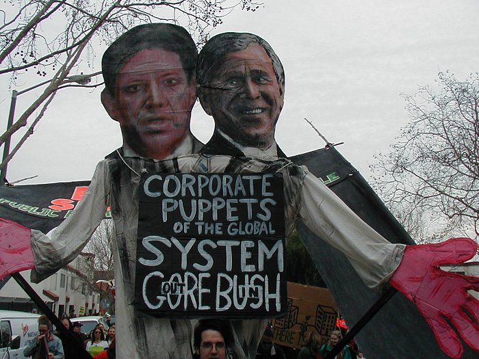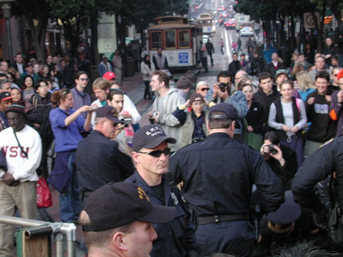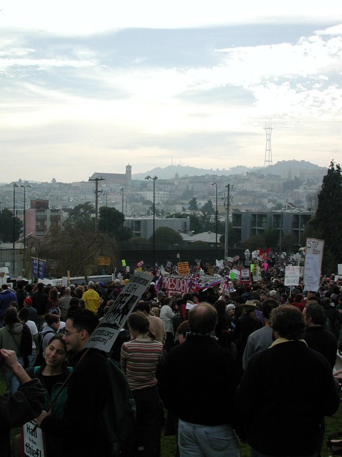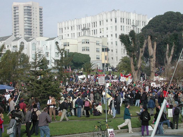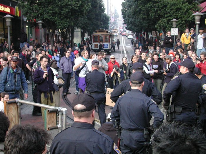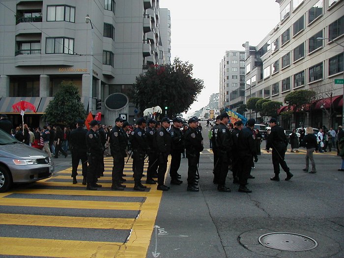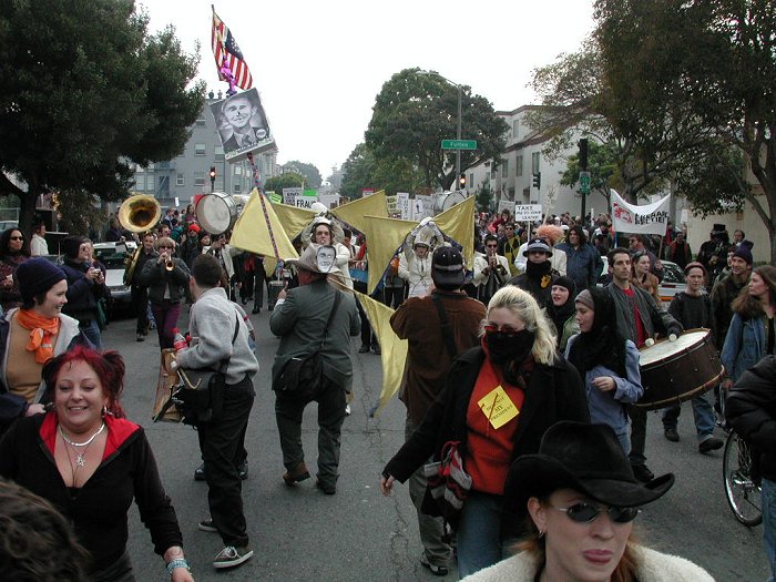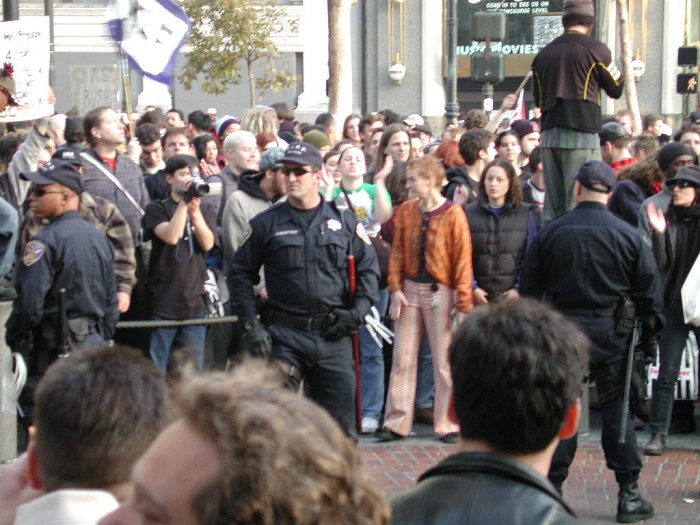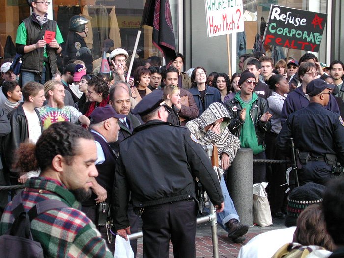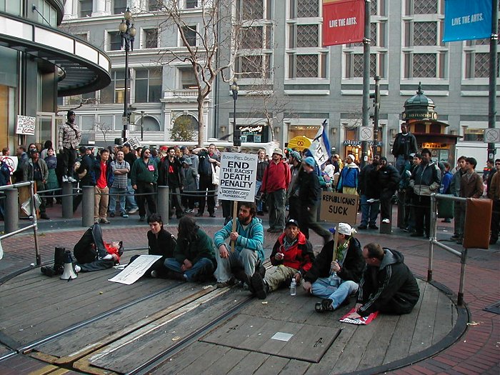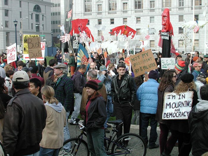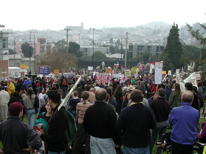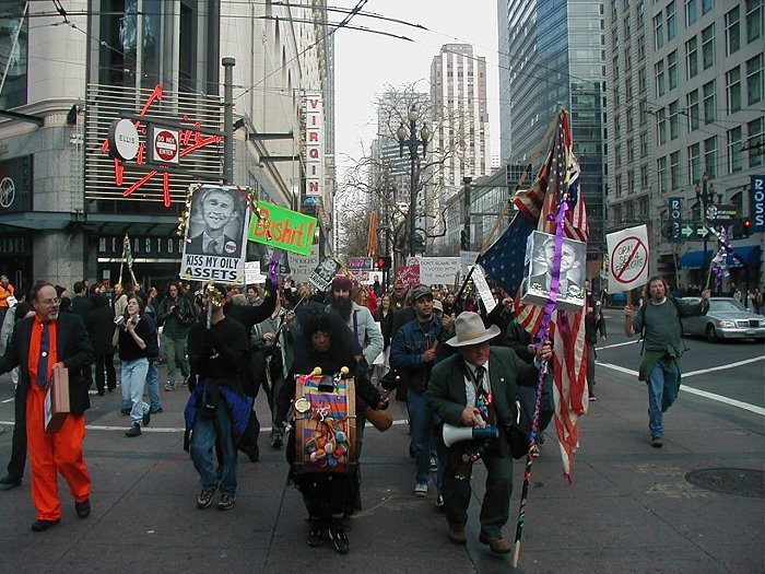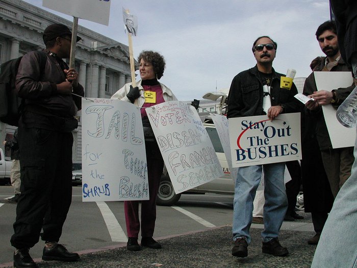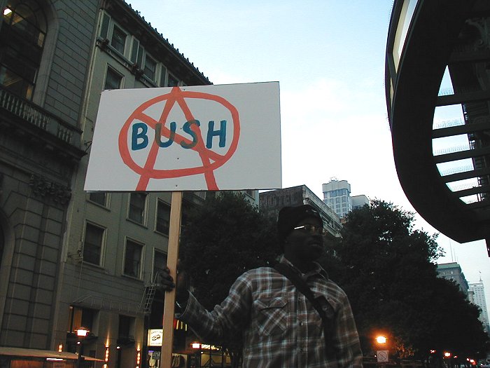 3/4/04: Bush returned to California today, with Air Force One touching down at Moffett Field just a few minutes before noon for a $1,000 per plate luncheon in Santa Clara. Along with some flag-waving pro-Bush-Cheney patriots, several hundred protesters were waiting for him outside the Convention Center to denounce the Adminstration's foreign and domestic agenda.