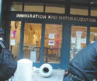 Farouk Abdel-Muhti was released from jail on April 12, 2004 after being held for two years without charge by U.S. immigration officials. He was frequently held in solitary confinement, subjected to extensive interrogation, and sometimes denied food. His supporters considered him to be a political prisoner.