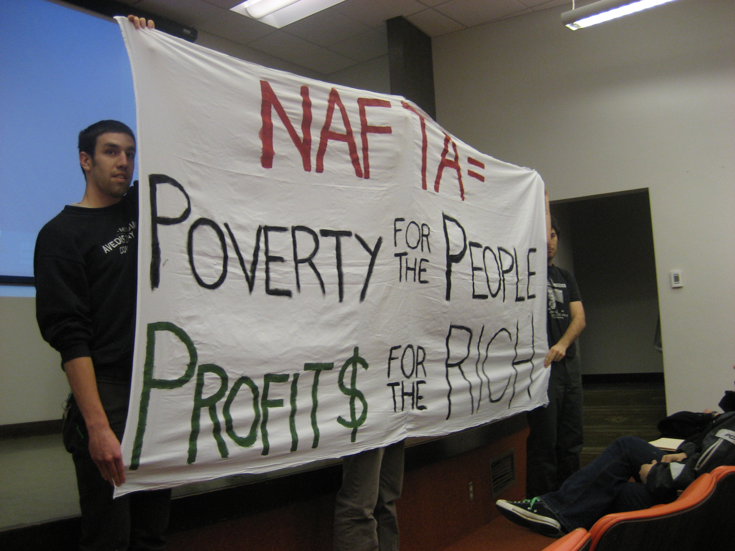 Holding banner in front of trade co...