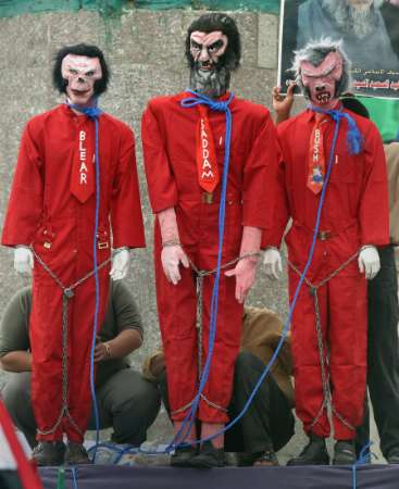 Mimicking the famous images of US soldiers and Iraqis pulling down a statue of Saddam as Baghdad fell, protesters toppled effigies of US President George Bush, British Prime Minister Tony Blair and Saddam - all dressed in red Iraqi prison jumpsuits that signified they had been condemned to death sentences.