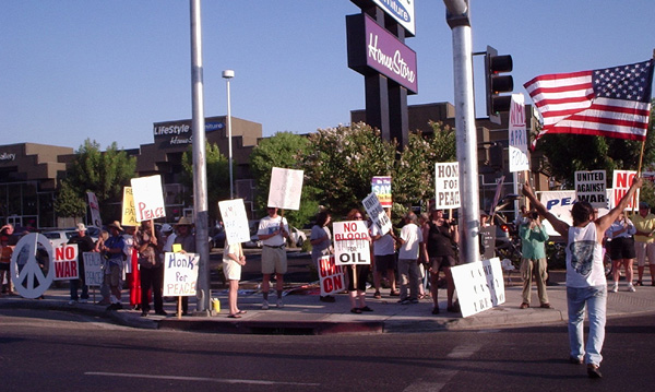 About 150 people turned out to support Cindy Sheehan in Fresno last night. The Anti-War protestors gathered at Blackstone and Shaw and spread out to all four corners of the major intersection. Hundreds of motorists honked in support of the vigil as they passed.