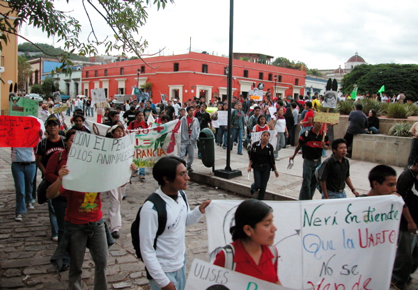 Me encuentro en la Plazuela del Carmen, entonces escucho susurros, que se hacen más fuertes. -"...educación primero al hijo del obrero, educación después al hijo del burgués...". Camino aprisa para encontrarme con la marcha de estudiantes de la UABJO (Universidad Autónoma Benito Juárez de Oaxaca), jóvenes no mayores de 25 años que caminan en dos filas, en medio de estas marcha la gente con pancartas, que acusan al rector Neri de utilizar el Plan Juárez, para disminuir la calidad de la educación, algunas de las propuestas de este plan son: privatizar la educación, aumento de cuotas, recorte de matriculas, eliminar el derecho de los estudiantes para poder elegir a su director, entre otras cosas. Lee más...