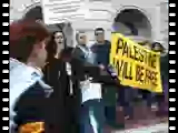 Speakers and Direct Action at UC Berkeley on April 9, 2002 at a Bay Area demonstration as part of a national day of action in response to Israeli military aggression and commemorating the 1948 massacre in the Palestinian village of Deir Yassin.