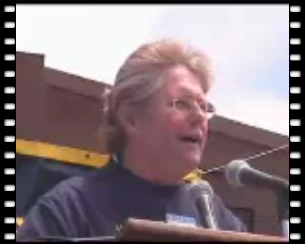 With three union contracts running at the Port of Oakland on 6/30/02, a rally was held on 6/27/02 during a break in negotiations. US workers wereinformed that general strikes are happening in Europe and Latin America to stop rollbacks, to protest privatization and challenge global corporate power. Here London dock worker Case Marges (spelling uncertain) address the rally.