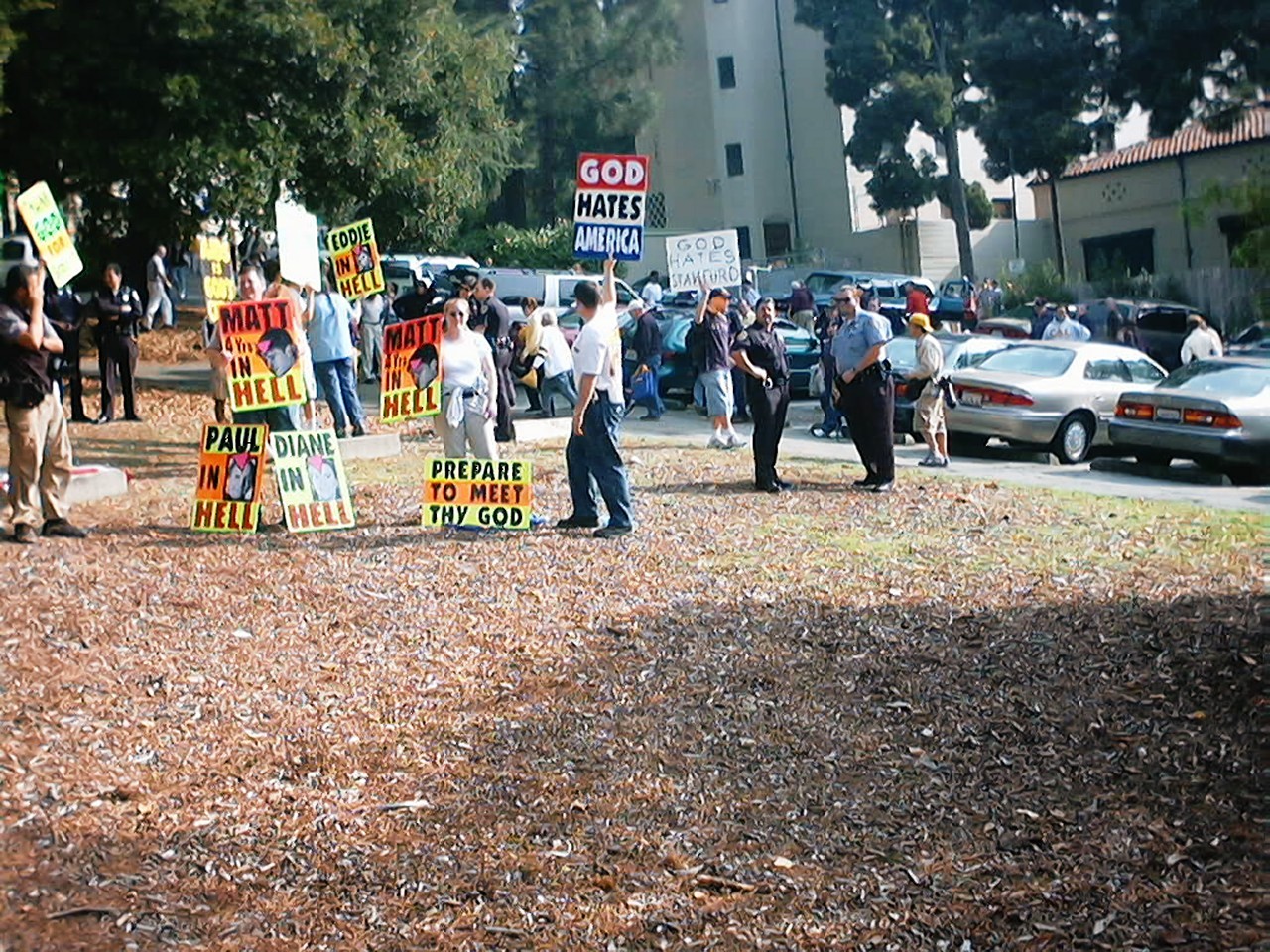I'd just like to know, where's me? The only picture you guys got of me was me standing behind my God Hates Fag Enablers sign? Is this discrimination? Next time I fly all the way to California, would you please take a picture of my pretty face? Oh, by the way if anyone would like to converse, please e-mail.