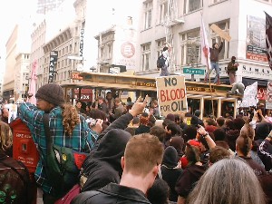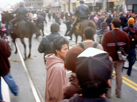 1. A group of 1000 marchers went near Union square where hundreds of police blocked streets which would have allowed them to get to the square. At one point, a number tried to run between police horses to get through and were pushed back. Some objects4Re thrown in the air.