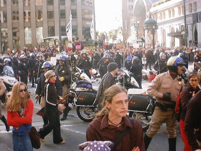 Meeting up with some friends again, we went along with the ANSWER march. A large group of 7-10000 went north and circled Union Square. A right winger threw food off his balcony at people. By this time, I had hardly seen any property damage around the city at all, and no one did anything objectionable at Union square. People walked towards the 2nd street onramp to the freeway. Police blocked this, and there was lots of running around by police chasing people through parking lots. Police started hitting people at a ramp near embarcadero under the bridge, and when someone yelled that tear gas was being released, there was a short stampede back. People went back down the hill towards the transbay bus ramp, and a few people ran up it, even though it is a really long ramp, but they turned and ran into the bus station. Police encircled the calmest and most peaceful part of the group while the more radical people walked back to Market. The police let the boxed in group leave, and they went to Market and were trailed by police back to Civic Center, where I left.