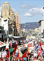 4/5:With over a thousand civilian casualties already reported in Iraq (and well over ten times as many dead Iraqi soldiers), Oakland took to the streets Saturday to demand an end to US aggression. Two feeder marches (one from UC Berkeley and another from MacArthur BART) met up with a rally at Mosswood Park. After about an hour of music and speakers, the crowd marched up Telegraph to Frank Ogawa Plaza. The rally and march were organized by the April 5th Coalition for Peace and Justice, an ad hoc coalition of groups representing labor, community, peace, civil rights and students.