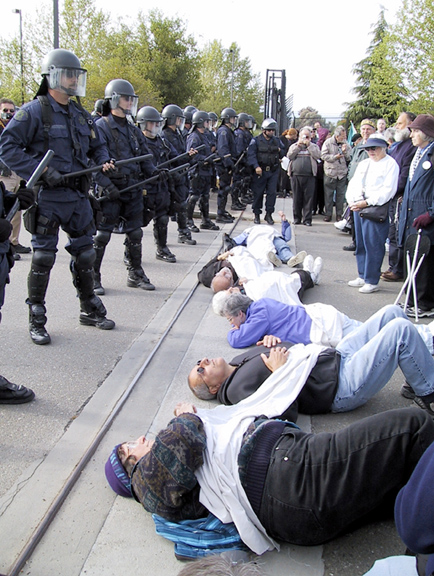 About 50 of the protesters put their bodies on the line to block one of the entrances to the lab and were arrested when they refused to budge. Officers in heavy pads with batons were ready to cart the peaceful protesters away to an outdoor holding pen at the lab for processing.