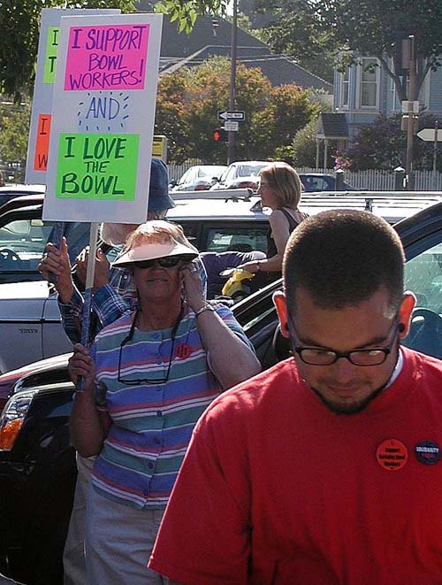 Nearly 100 activists gathered on the sidewalk near Berkeley Bowl Sunday to show their support for Berkeley Bowl workers. Berkeley Bowl workers have been trying to unionize and have come up against strong resistance from management; management has been giving employees anti-Union progaganda and have even fired one organizer.