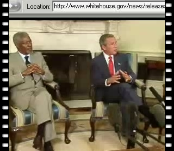 This realplayer clip (1.1mb) shows bush uttering a complete fabrication, yet he doesn't even know how stupid he looks. the priceless part is kofi annan looking off to the side when bush utters the big one, as if to say- 'OMG what a friggin moron'. needless to say the press conference was cut short as soon as bush ended his sentence.