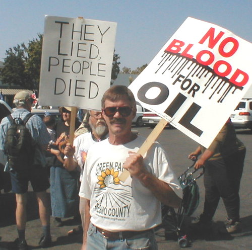 While the theme of today’s anti-war rally was to end the occupation and prevent future wars, many activists were talking about ways to stop pResident Bush. There were, for example, many Kucinich supporters in the crowd. Steve Malm said he was there to show his opposition to repressive legislation like the Patriot Act and “to show support for Dennis Kucinich who is a viable peace candidate.” Peace Fresno activists were also busy handing out fliers to organize a demonstration against Bush when he comes to Fresno on October 15. Bush will be appearing at a $1,000+ a plate lunch at the Fresno Convention Center. The demonstration will start at 10AM at "M" St. & Ventura Outside the Fresno Convention Center SOUTH Exhibit Hall. For more details about the planned demonstration, go to http://www.peacefresno.org .