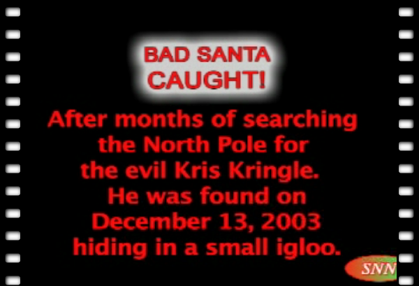 Using the Centcom's press conference footage of Saddam Hussein's capture, the fictitious Santa News Network breaks the story of Bad Santa being captured.