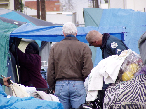 Some of the homeless asked me why the only solution the City has to this problem is a police action? Dante Johnson would like to know why they don’t open up some of the vacant buildings in the downtown area. As his community was being crushed and stuffed into CalTrans trucks behind me he pointed to vacant buildings all around and asked why those couldn’t be used to house the homeless, provide services, and meet pressing human needs. “It is cold out here, someone is going to die of exposure during the rain and freezing weather,” Johnson added.