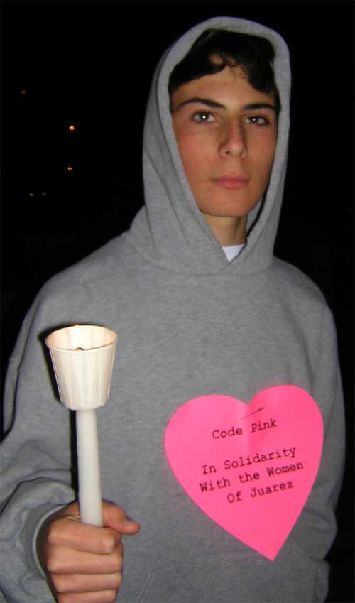 About 25 people gathered at Dolores Park for a candlelight vigil in solidarity with the vigil that occurred the same night in Juarez, Mexico. Hundreds of women have disappeared in Juarez, with mutilated bodies appearing around the area; demonstrations on 2/14 remembered these women.