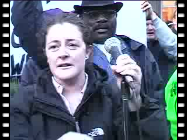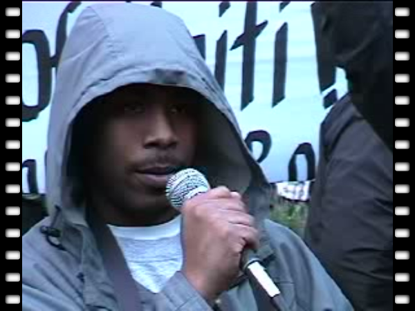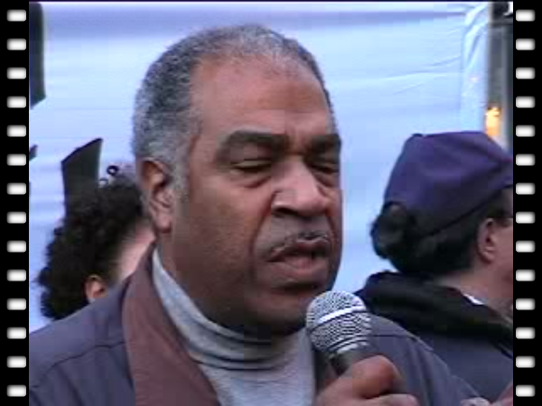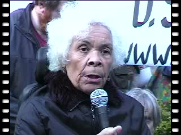 Kiilu Nyasha of KPOO / Black Panthers reminds the crowd that Haiti was forced by the European powers to pay $21 billion reparations for freeing itself from slavery.