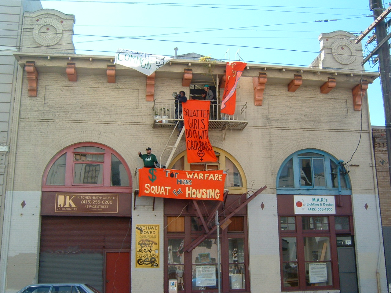 Leary of the chaos that consumed Market Street and much of downtown last year, at the dawn of Gulf War II, swarms of police wearing riot helmets and wielding billy clubs were prepared to contain Direct Action to Stop the War’s 7 a.m. gathering at Justin Herman Plaza and subsequent Bechtel Headquarters protest. But when a sub-group that had continued marching up Market turned onto Page Street, the police where caught off-guard. Occupied by keeping people on the sidewalks, distracted police were unable to prevent a group of about 25 squatters’ rights activists from storming through the entrance of an unoccupied building at 47 Page Street. The Autonomous Collective, a local anti-capitalist group, orchestrated the morning-long stand-off in order to draw attention to the affordable housing shortage and rampant homelessness that continue to plague San Francisco.