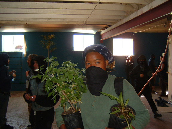 The squatters hoped to make the connection between the anti-war protests and the building takeover clear with a “$ for Warfare means Squat for Housing” banner, which hundreds of onlookers and the mainstream media could see hanging across the façade of the building. The purpose of the small tree adorning the balcony and hay scattered across the sidewalk was not as blatant, but Camala, a bandanna-d squatter carrying several potted plants up to the rooftop, explained, “The Bush administration wants to spend our tax dollars on bombs, instead of housing, education, health care and social services. By growing your own food, you can be less reliant on the neoliberal corporations that facilitate our government’s irresponsible actions, so that’s why we’re trying to start a garden here.”