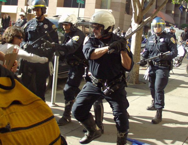 I was a part of the breakaway march on march 20th in San Francisco that departed civic center toward 5th and market and the shopping district to disrupt business as usual. The police blocked market street at 5th to prevent us from mixing with the shoppers and shops and proceeded within a few minutes to corral over 80 people on market street for mass arrest. We stuck around for ten minutes to witness the arrests and then broke away to go up a few blocks and around the police blockade and cross over to powell street so we could interrupt the shopping district with our anti-war message. The incident that I am about to describe is pictured above and as the cover photo for the story. The photo pictures officer Aicardo #625 in a full swing at pedestrians. I say pedestrians because after receiving orders to vacate the street 90% of the people did just that, vacated the street immediately and that is why the SFPD was only able to corral 80 some people out of a 1,000 plus march only a few minutes after the order and as the crowd was in retreat backing away from advancing officers. As we went up this hill to go around the police barricade we were met by a wall of police spanning the street and sidewalk. I walked up calmly to officer Aicardo #625 with my palms open and forward as civil disobedience training dictates. I asked him why he was blocking the sidewalk. I said we are not in the street, we are pedestrians and we have a right to utilize the sidewalk and you have no right to block us from use of the sidewalk. At that point officer Aicardo # 625 jabbed me in the ribs as hard as he could with his stick, I kept my hands in full view, attempting to ask this enraged officer what he thought he was doing. I backed away from his attack which he then turned against a defenseless woman standing near the wall. I moved to the left an spoke with an african-american officer about how blacks were beaten in the streets 40 years ago and it still isn't right. This officer told people to back up and held his formation with his fellow officers but did not unnecessarily lose his cool and begin swinging on people indiscriminately as officer Aicardo #625 did. Aicardo #625 did not hold the line with his fellow officers which would have been sufficient to keep the demonstrators from entering the shopping district who as I said were following police directions as given, and on this particular corner there were only about 20 of us. We were not in the street, no one was in any type of threatening stance, I don't recall that any of us there were wearing masks or black clothes either. I myself was wearing a white t-shirt and nothing on my head. Officer Aicardo #625 was incensed by my questioning of why he was obstructing the sidewalk and proceeded to advance and attack any pedestrian within reach. My complaint is not that the police do not have a role to play or a job to do, even on that particular day. I do disagree with Mayor Newtsoms orders, and do believe that we have a fundamental right, in a time of war and turmoil to take to the streets without license, and voice our opposition to the war, and interrupt business as usual without any destruction of property or harming of human life. The mission statement of the SFPD in their statement of values actually says "Our highest priority is the protection of human life", "We treat members of the public with respect and dignity. We maintain the highest levels of integrity and professionalism in all actions", and "We believe that policing strategies must preserve and advance democratic values". The police decided that it was there imperative to inflict harm on anti-war demonstrators who were in the streets, or on the sidewalk or anywhere. The police decided to assume that people who were dressed in a particular way, namely wearing black clothes, were ‘criminals’ and that they deserved to be brutalized, beaten and arrested. The police decided, perhaps at the prompting of the Department of Homeland Conformity, that any forceful political _expression needed to be crushed and repressed. The rage being demonstrated by many officers on saturday was above and beyond the call of duty and clearly has personal motivations due to peoples social-political dispositions. The scary thing is not what these out of control cops actually accomplish, they are entirely inept and slobby, and they only broke one arm saturday. But to watch this enraged pig Aicardo #625 riot on the public and lose control of himself, I am more fearful of what this cop tried and hoped to achieve if he actually landed any of his blows, I ducked and avoided several swings. This attack was entirely unprovoked by the citizens who were present at this incident. Officer Aicardo #625 was going on his orders, which need to be questioned, and on his rage, which needs to be questioned. My concern is with disciplining this particular officer but also with challenging the use of hatred and anger by police officers who are supposed to be, as their name indicates, officers of peace. The question must be raised of whether police should be motivated by anger, hatred and insensitivity and identifying their hateful behavior when it surfaces. Provocation and pre-emptive policing as such have no place in a democratic republic, especially when you are dealing with citizens not criminals, and certainly not in a ‘progressive’ city such as San Francisco. Mayor Gavin Newtsom gave the orders to repress us. Your little honeymoon and time of acceptance for the gay marriage stint is over Newtsom, OVER, we do not like you at all, we know you are an enemy to our city. The police took the streets from us that day. We will have the streets back this Friday for CRITICAL MASS meeting at 5pm at the end of market street embarcadero to cycle wild through the city. To all Newts and Pigs, THE STREETS ARE OURS, WE WILL HAVE THEM BACK!