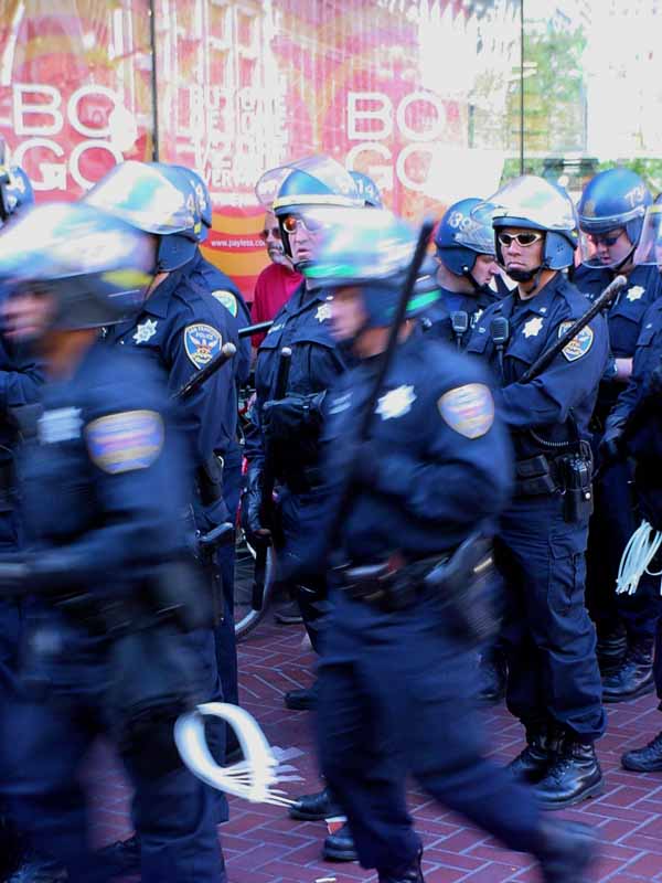 I saw this guy first at the crest of a hill. My impression is that he is just a San Franciscan who'd been on his bike, and came up behind a line of cops faster than they liked. This surprised them, and they started wailing on him. At some point, he picked up a stick. Don't know if he'd had it to start with, or if he got it off the ground in self-defense. He ultimately got away from them, and more power to him. The analogy with ordering 30 oinks to sprint into a crowd from behind it is pretty clear, though: when you surprise people from behind, they get twitchy. So it probably shouldn't be a surprise that what started as a fairly orderly "disperse or be arrested" near Nordstroms went south when a ton of tac officers got ordered out from cover. What, the poor piggies were only going to be able to arrest 50 people who hadn't heard the order, instead of 80?