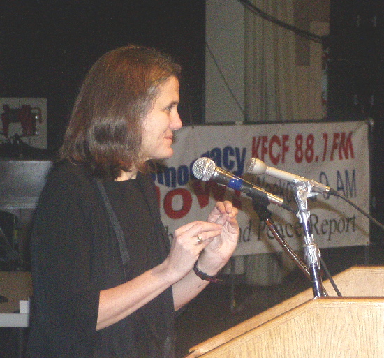 The video Independent Media In A Time Of War was shown at the beginning of the program. The message was clear - we can’t depend on corporate media to provide us a "fair and balanced" presentation of the news. They represent corporate interests that rarely allow the voice of opposition to be heard. With embedded reporters in the U. S. military in Iraq and generals on all of the news stations Amy Goodman asks why the corporate media does not interview peace activists? In addition to military experts on news channels why not also have doctors who can explain what happens when a cluster bomb enters a persons body or shrapnel blows off someone’s foot? In a study conducted the week leading up to Collin Powell’s visit to the UN for authorization to go to war and the week immediately after - Fairness & Accuracy in Reporting (FAIR) found that out of 393 interviews on CBS, NBC, ABC, and PBS about the war, only 3 were conducted with people who were opposed to the US invasion.