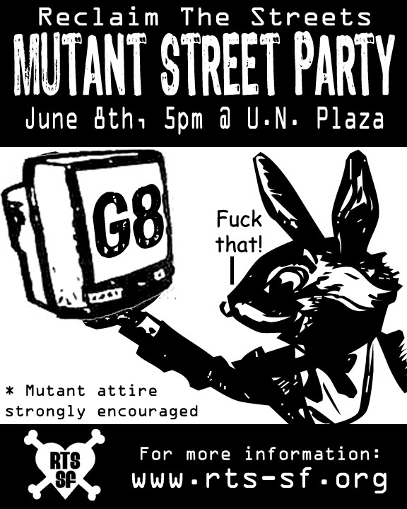 A FREE renegade street party will UNwelcome the Biotech Conference to San Francisco (June 3-9), and toast the death of the G8 (meeting in GA, June 8-10). Meet at 5 PM, well head out around 6 and head to the street party location.