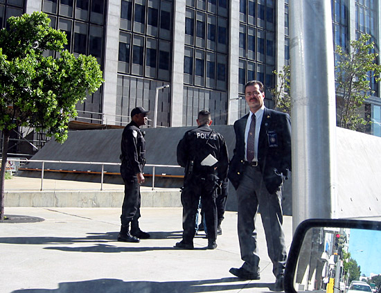 Personal log: I was assisting Reclaim the Commons organizer Lori with the sound system for the rally at the Federal Building at 9:20 am. We were about to begin unloading the sound equipment from her car for the 10:00 am rally when we quickly found ourselves surrounded by heavily equipped police. As the person who had negotiated and received the three separate permits required for the rally and march, Lori began to introduce herself. The police were “not friendly” and demanded her car registration and drivers license. I attempted to exit the car and was ordered back into the car. Police began handcuffing Lori, and I took a photo of the scene from within the car (last photo – view of Lori is obstructed). A Federal Building agent witnessed my photography, and police officer Baily immediately demanded that I turn over my camera to him. I asked Officer Baily a few times what the legal basis was for his demand, to which he replied, “do you want to go to jail?” To help ensure the rally went on as planned, I turned over my camera (it was returned to me after Lori was taken away). Lori fully believed that she had completely taken care of the four-year-old traffic violation that the police claim is the basis for the bench warrant issued for her arrest. Lori had met with police representatives to secure permits, renewed her car registration, and renewed her drivers’ license all without incident within the last couple of months.