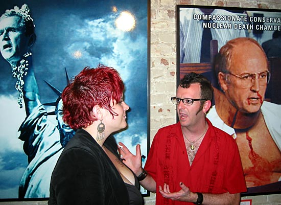 Here are a few photos of the Not in Our Name sponsored anti-militarism art show “Fear will not silence us!” Saturday night, June 26. The evening featured two levels of art, donated by dozens of artists, with over 150 pieces showcased against a backdrop of live music and DJs near Jack London Square, Oakland. Nearly 300 people attended which helped raise funds to send youth and activists to New York City to build the mass protests against the entire agenda of war and repression during the Republican National Convention August 29 through September 2. “More than a Million in the Streets when the Bush Team Meets!”