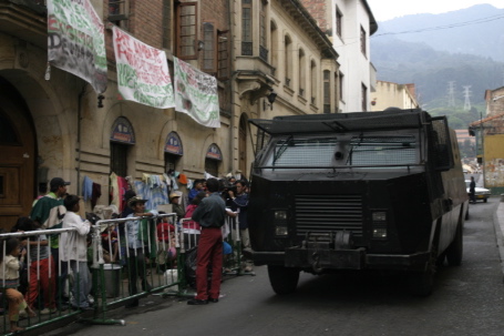 The police and military have responded by beating two pregnant women and a child. They came to expel us from the Ministry of the Environment at 3AM with orders to take us out of Bogota. It seems that this was an order by Sabas Peralt de la Vega and President Uribe because they don’t want anything to do with us.