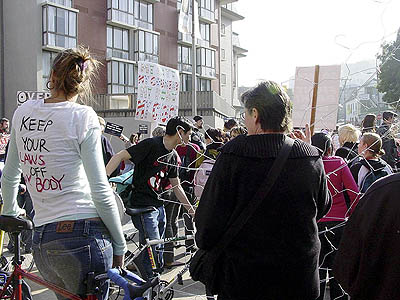 The anti-choice march, consisting of conservative christians bussed in from all over the United States and California, met verbal resistance by Bay Area people for choice.