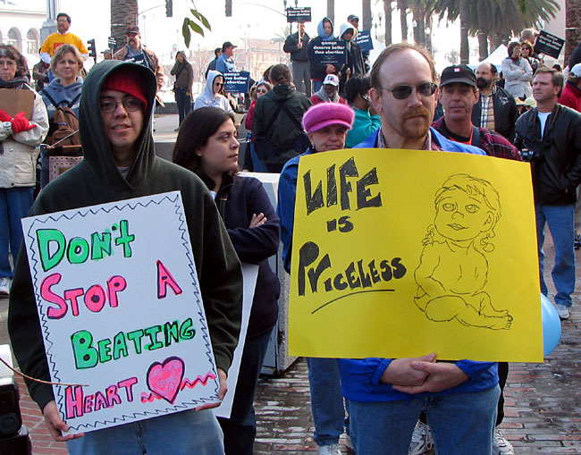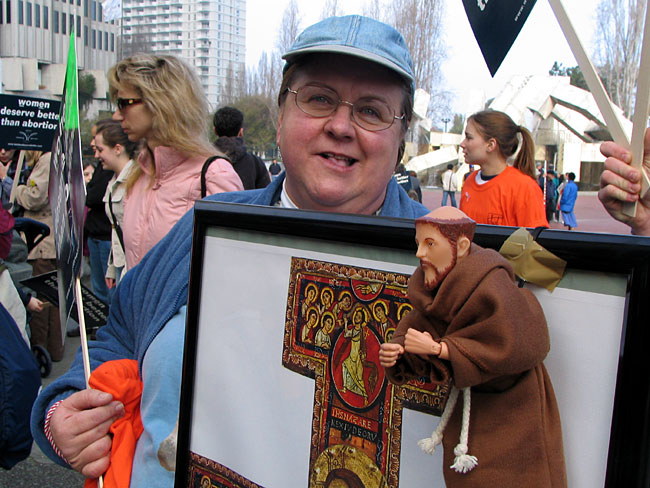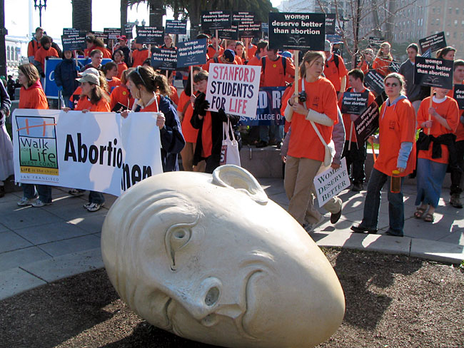 About 7,000 anti-choice marchers converged on San Francisco from throughout California for what organizers hoped was the first annual west coast "Walk for Life." Organizers went to great effort to put forward a unified moderate message, “Women deserve better (than abortion).” Under the second Bush administration, anti-choice organizers are confident of making significant gains for their agenda and are delighted to promote “Feminists for Life” in San Francisco in order to take the focus off of the extremists among them.