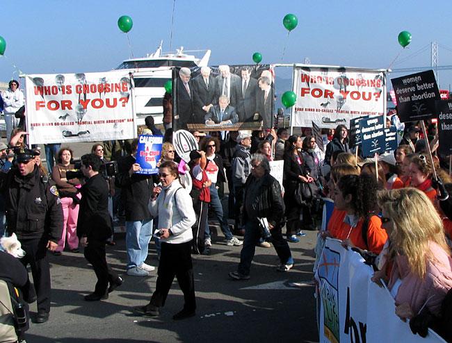In opposition to anti-choice SF mobilization, thousands marched from Powell and Market to the Embarcadero to keep abortion legal. Most then lined the march route to confront the anti-choice marchers.