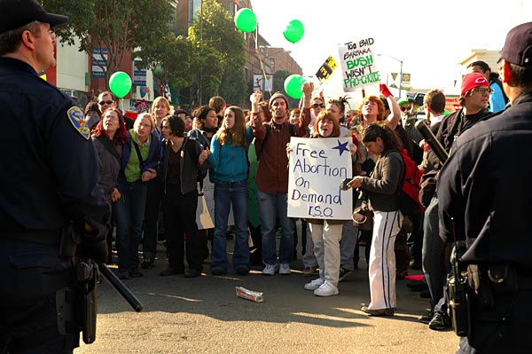San Francisco - On the 32nd anniversary of Roe vs Wade, thousands of anti-choice demonstrators marched from the Embarcadero to the Marina in what they are calling the First Annual Walk for Life. Many were bussed in from the Central Valley and other conservative parts of Northern California and Nevada. They were met by thousands of pro-choice demonstrators who held their own rally at Powell and Market, then marched to the Embarcadero where they lined the streets as the anti-choice groups marched past.