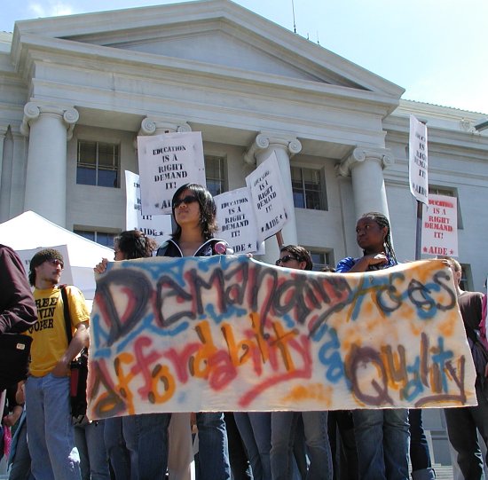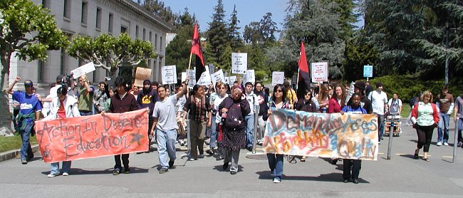 On Wedneday 4/20/2005 several dozen students gathered at People's Park and marched to the Berkeley Campus to protest budget cuts and fee hikes.