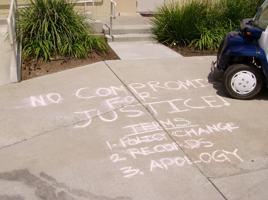 Several administration officials said that it was against regulations for the students to camp out in front of the administration building. They said all "free speech" activities must be held in the Free Speech area, near the student union. But, when it was clear that the students would not back down, the administrators and campus police backed off. deGraff said "that the police came by last night and hassled us about the chalk drawings on the sidewalk." The police asked the students who was responsible for the "vandalism?" Not finding anyone to cite for the crime of using chalk, that washes off with water, the officers left. One of the students commented that "it is amazing how the school has money to pay for the police to infiltrate our events and harass us for using chalk on the sidewalk, but they are cutting music and sports classes because they don’t have the money."