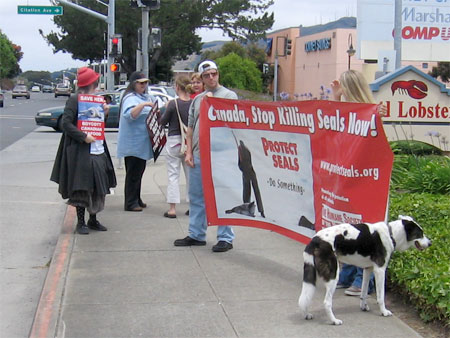 As part of a nationwide HSUS-coordinated Day of Action Against Red Lobster, we had about 20 people at our demo in San Bruno (1210 El Camino Real), and handed out a bunch of flyers to people in cars passing by, and to Red Lobster patrons - we even got 5 patrons to turn away and not eat at Red Lobster! In addition, we collected signatures on letters to send to Red Lobster telling them that people will not be going to their restaurants until they join the boycott of Canadian Seafood to put the needed economic pressure on the Canadian fishing industry to get them to ask the Canadian Department of Fishing and Oceans to stop the seal slaughter. We were also covered by a local news radio station (740 am) - unfortunately, they do not have their coverage online. Here are some pictures from our demo.