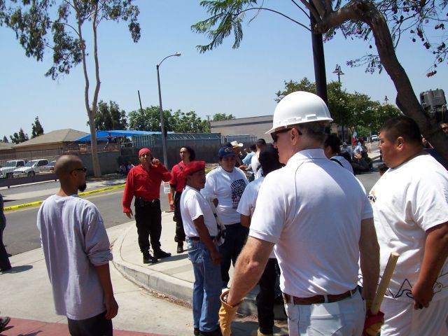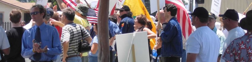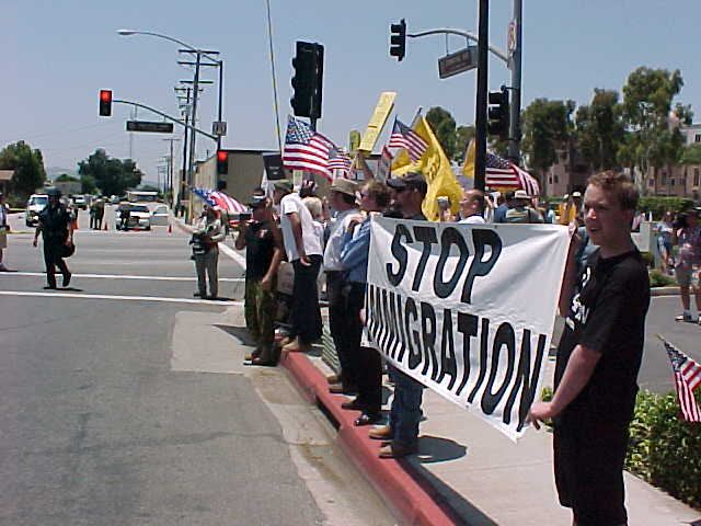 Another view of the SOS demonstration in Baldwin Park, California on Saturday, June 25, 2005 with the same white supremacists holding the "STOP IMMIGRATION" banner. This same banner would later be used in an anti-Home Depot protest in Santa Clarita, California on July 10, 2005. Photo sent to me anonymously via email.