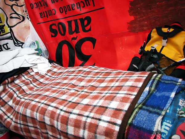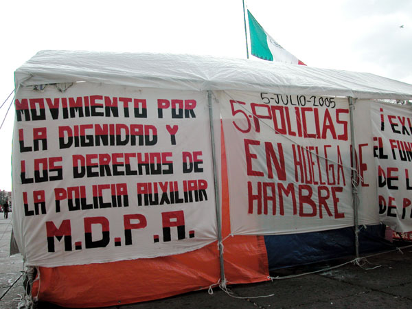 July 28, 2005 - Bernardo, Guillermo and Miguel are three of five former Auxiliary Police from Mexico City, Mexico. For 23 days, they have been living in a cloth tent with styrofoam beds in the Zolcalo in front of the office of Governor Andrés Manuel López Obrador (AMLO). In 2000, AMLO declared that the labor conditions for police would improve, that they would receive a fair salary, quality medical service, and that the corruption within the police force would come to an end.
