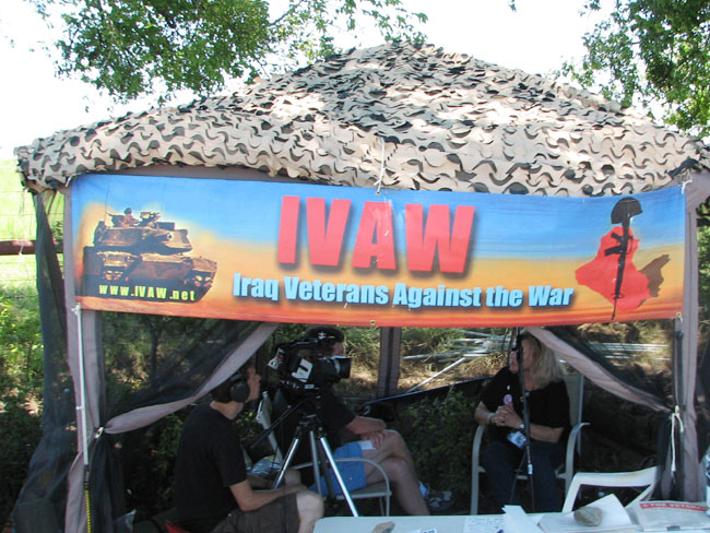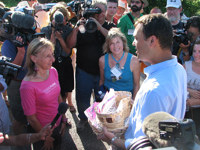The stand off continues in Central Texas as about 200 folks from across Texas and the country camp along side the road leading to the Bush vacation ranch near Crawford. Every day Cindy Sheehan has greeted newly arriving Gold Star Families for Peace and other military family members -- and today was no different. Due to a family emergency, Cindy left for California for a couple of days and plans on returning to Crawford this weekend. Press conferences and other events are moving forward, and people are being encouraged to continue making their way to Crawford. Many new visitors are expected this weekend, including a few well know musicians and other “celebs.” This evening, a march of over a hundred women trooped up the road a couple of miles to deliver anti-war messages to Bush's wife Laura. At the final Secret Service roadblock, surrounded by a throng of media, a White House representative accepted the baskets of letters.